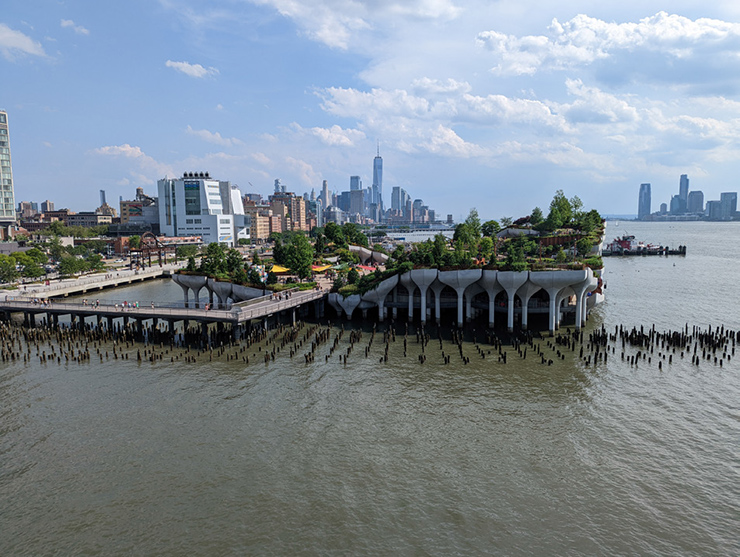 Within walking distance of the High Line and the Whitney Museum is a privately financed concrete island elevated on pilings above the Hudson River. It offers winding trails with unique views of the city, but more likely it is a place to see the fashionable crowd of Manhattanites and foreign tourists excited about the city’s newest green spot. From the southern tip of Little Island, one can see construction on Gansevoort Peninsula, a former sanitation garage that is also on its way to becoming a park, the latest addition to the ribbon of green spaces on the Hudson River on Manhattan’s west side.