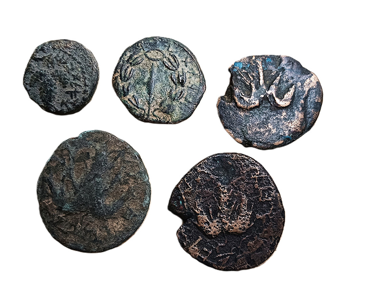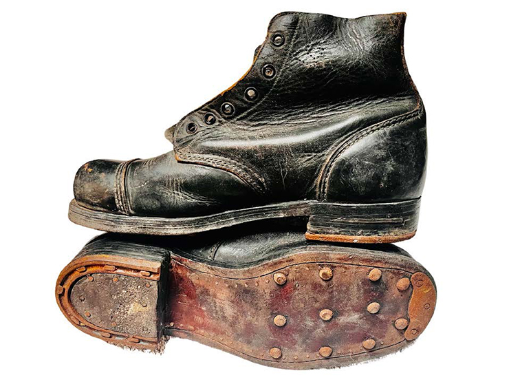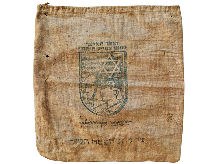 There are soldiers’ boots from World War II, British made, from 1941, with a stamped letter tzadi on them. There is an IDF Haggadah from the War of Independence by Chief Military Rabbi General Shlomo Gorenchik (Goren), 1949. There is an iconic photo of Rabbi Goren blowing the shofar at the Kosel on June 7, 1967, taken by the famous photographer David Rubinger. There is a 1920 art noveau Seder plate from Czechoslovakia. There are ancient bronze Bar Kochba revolt coins from 132-135 CE.