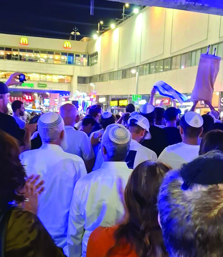 That night, the Hakafos Shniyos passed by the Dizengoff Center accompanied by music, singing, and dancing. Once again, people nearby came forward to kiss the Torah and were caught up in the celebration.