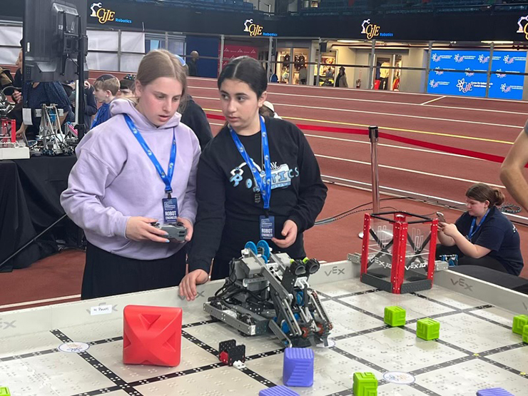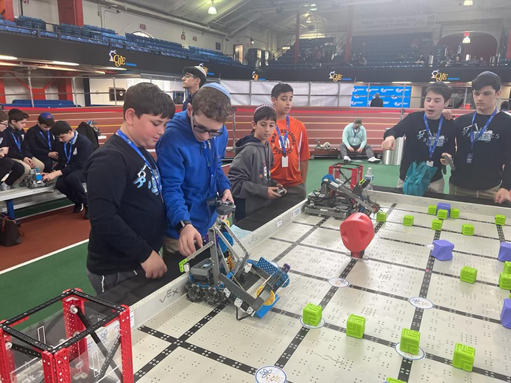 On Monday, HANC Middle School sent five teams of students to compete in the CIJE (Center for Initiatives in Jewish Education) Inter-Yeshiva annual Vex Robotics Tournament at the Port Washington Armory. Over the course of the school year, each team built a highly sophisticated robot with a large arm that can be manipulated into several positions. Nine tournament fields were spread throughout the room, and each team participated in seven matches. At each field, teams would navigate their own robot through a maze of objects, retrieving objects and moving them to designated places on the field.