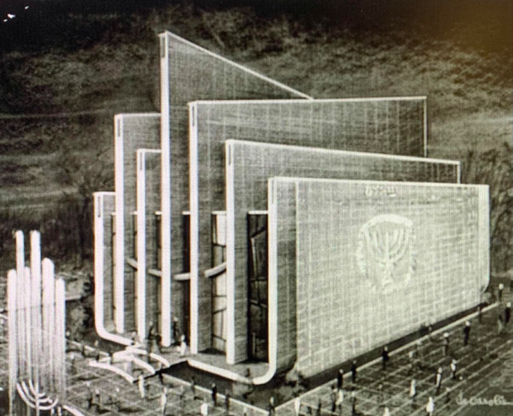 Inspired by a six-branched menorah, the building’s facade has seven panels of concrete connected by glass, surrounded by a moat. The tops of these panels appear jagged from above, seemingly like sheets of paper from the People of the Book. On the outermost panel would be a relief of the State emblem, the menorah that appears on the Arch of Titus in Rome. Finally, in front of this pavilion there would have been a menorah sculpture fountain.