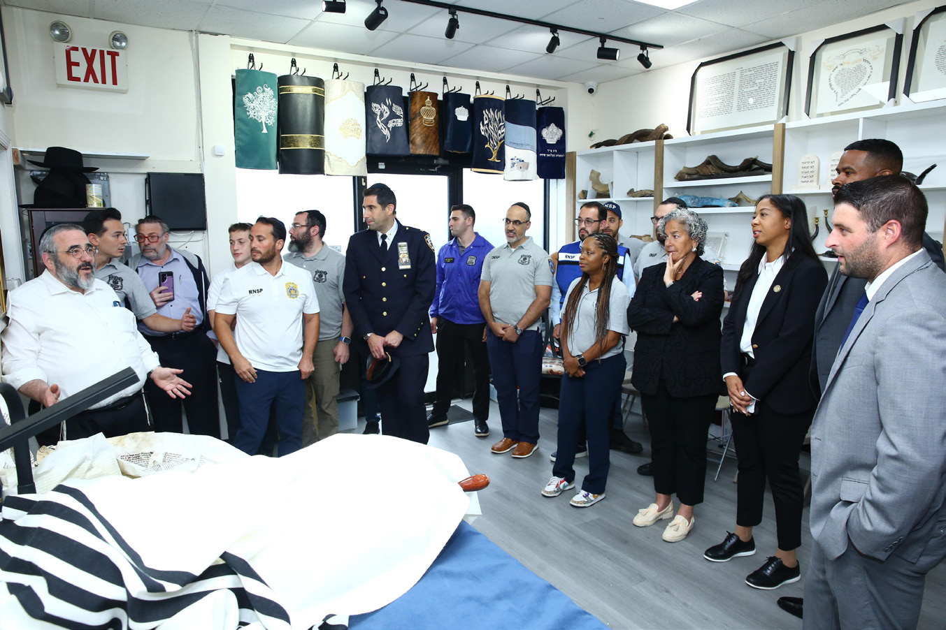 On Thursday, August 8, members of the RNSP, Assemblywoman Stacey Pheffer Amato, Councilwoman Selvena Brooks Powers, NYPD Deputy Chief Richie Taylor, the owner of the sefer Torah, and Rabbi Akiva Oppen joined together to express thanks and appreciation to the detectives of the Major Case Squad who had led the investigation. Assemblywoman Stacey Pheffer Amato awarded citations in honor of this important arrest and the Torah’s recovery. Rabbi Oppen explained to the guests in great detail about the importance of a Torah scroll, how the letters are written, the time it takes to write each column, and other relevant topics. The detectives were fascinated and asked many questions. Representatives of the Far Rockaway and Five Towns Jewish community explained how incredibly meaningful and important this case was to them and expressed their profound appreciation for the efforts of the detectives and RNSP.