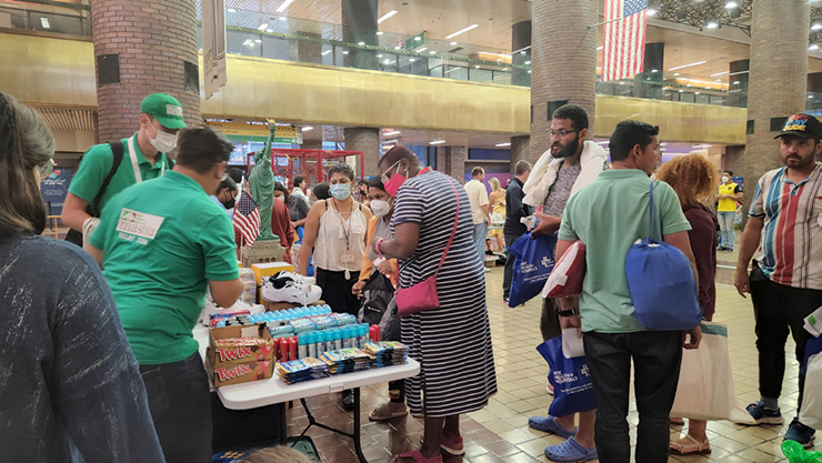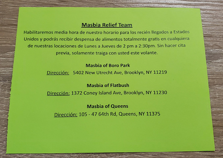 The Masbia Soup Kitchen Network, which has three locations in New York City and operates a digital breadline for eight hours every day in ten languages, is now reserving time slots for asylum seekers. Since appointments on the digital breadline known as the Plentiful App, are in high demand, and regulars pounce on them as soon as they become available, Masbia will now reserve a half hour every day (2-2:30 p.m.) for newly arrived asylum seekers to New York City to receive free raw food packages at any of Masbia’s three locations. Spanish flyers with this information are distributed by the Masbia Relief Team, along with free, brand-new socks and shoes as they come off the buses at the Port Authority Bus Terminal in Midtown.