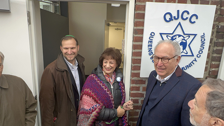 “It’s hard to stand here and not be in the moment with everything that is going on in the world,” asserted Council Member James F. Gennaro. “So, we fight for the right thing, we fight for Yiddishkeit, we fight to feed the poor, and we fight to move the world forward in a positive way, one QJCC at a time. That’s how we do it.” Before embracing Nussbaum for his bringing the new offices to light, Gennaro publicly thanked his colleague Lynn Schulman of Forest Hills, where the QJCC has been based, for being “a great champion for Israel.”