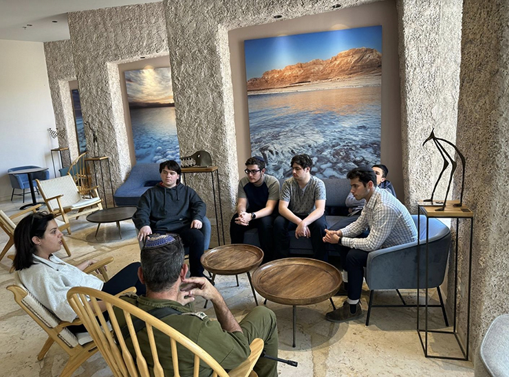 The following day, the group met with evacuated civilians from southern and northern communities in Israel who are currently living in kibbutzim Almog and Kalya. These courageous evacuated people spoke about being refugees in their own country, not knowing when they’ll return home, family issues that arise in such conditions, and dealing with children’s education. One representative of these hundreds of thousands of Israelis recounted his first visit home since October 7, where he found his food from Simchas Torah still hauntingly where he had left it. The group also heard from a member of Kibbutz Shuva about how their kibbutz was miraculously saved from attack on that tragic Simchas Torah morning. The meetings were graciously facilitated by Colonel Binyamin, who spoke about how neither he, nor the other colonels and soldiers with whom he’s working, are career soldiers; they are consultants, teachers, electricians, etc., totally leaving their businesses and livelihoods on indefinite pause to serve their country and people.