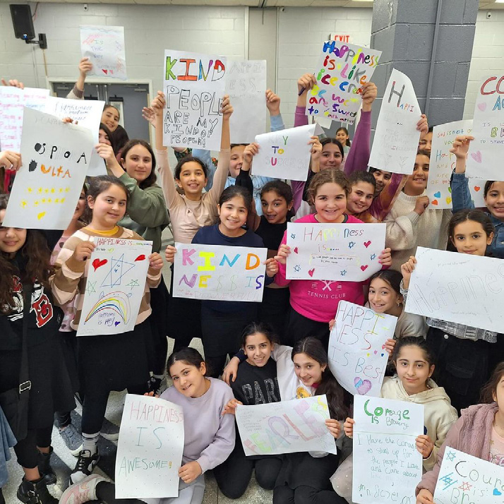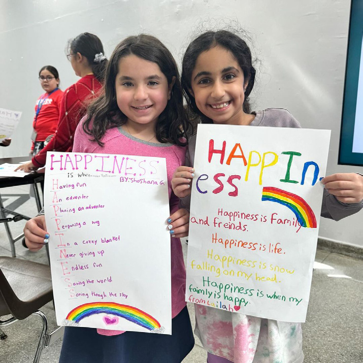 After Mrs. Garber’s inspiring talk, she asked students what the values of happiness and courage meant to them. These are two themes she often writes about in her books, and two values especially relevant to the holiday of Purim. Students expressed what those emotions meant to them by creating beautiful posters.