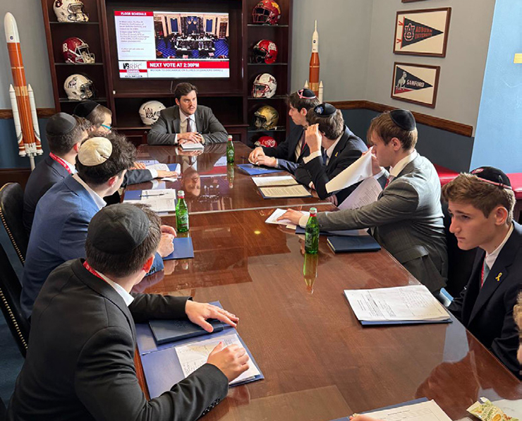 It was a critical day to be on the Hill. Senator Bernie Sanders of Vermont brought two resolutions to the floor with the goal to block aid to Israel. The Lobbying Lions met with eight different members of Congress in their efforts to stop this motion. In one such meeting, a group of talmidim met with Senator Tim Sheehy of Montana to express their concerns about the upcoming vote. The Senator invited them to the Senate gallery to watch him cast his vote against the motions.