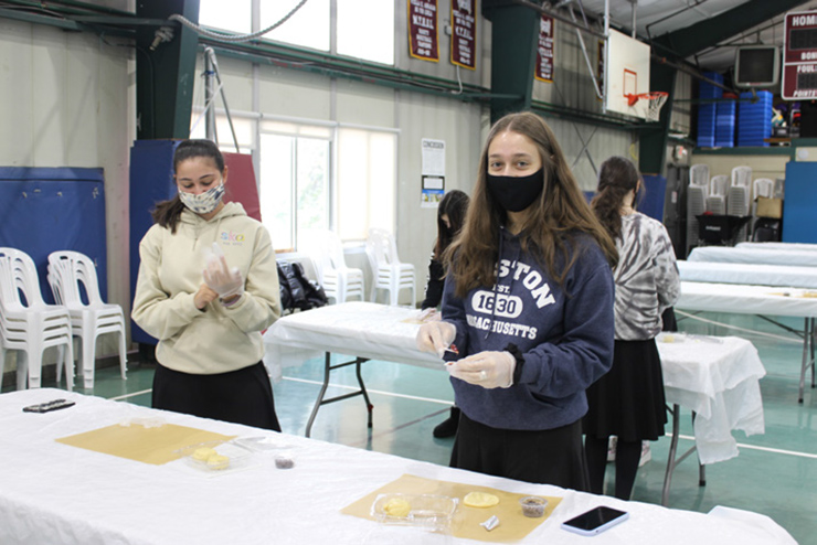 While social distancing was maintained on the rink, students also had the opportunity to make hamantashen in the SKA gym. Prepared packages of dough, filler, and chocolate chips were utilized by happy bakers to create variations of this yom tov treat.