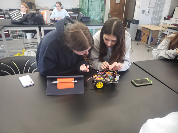 The students in Mr. Andres Pabon’s Remote Sensing group wired up different types of sensors on a robot. Student participants were Elizabeth Naiman, Meira Norensberg, and Tamar Rabinovitz.