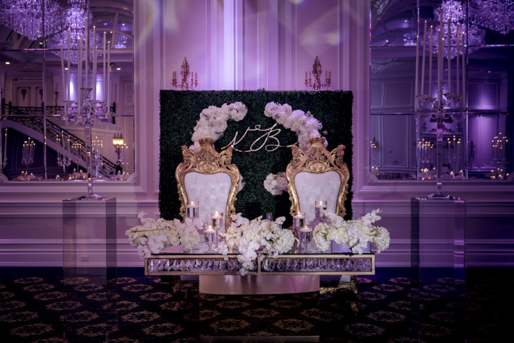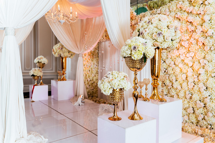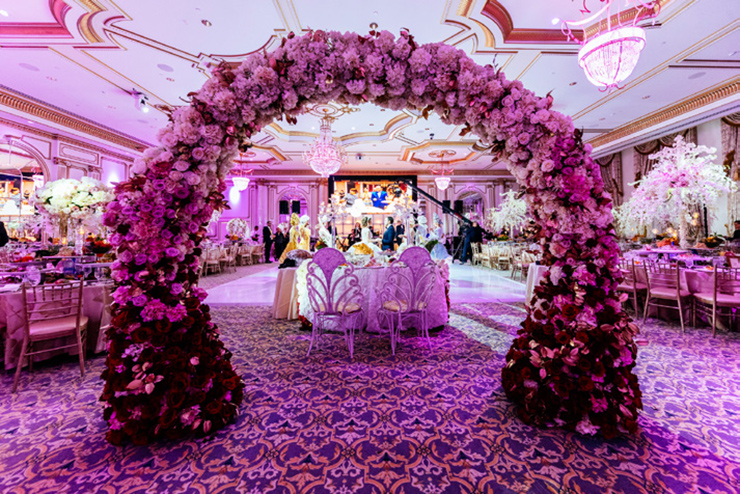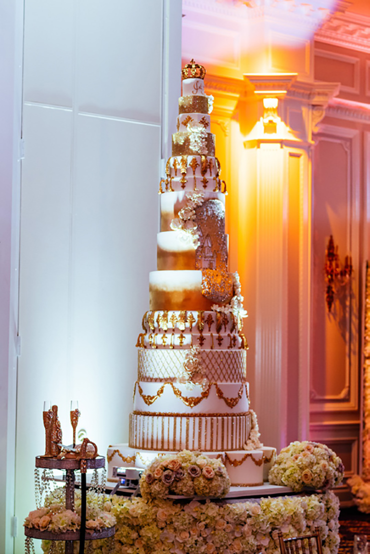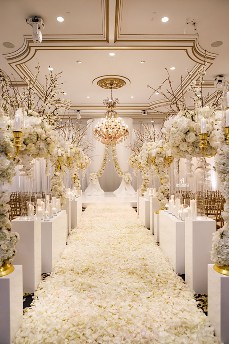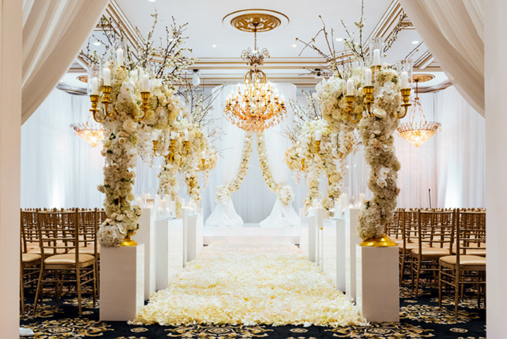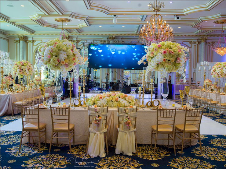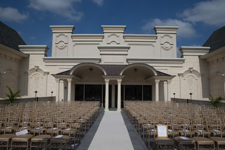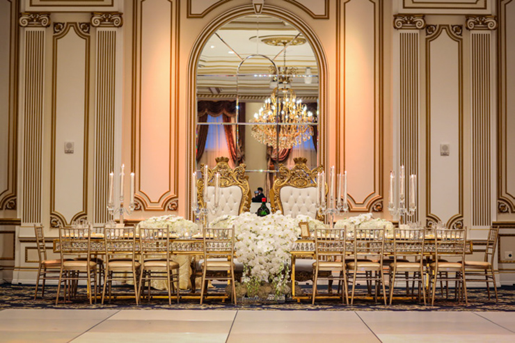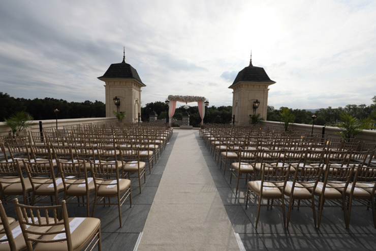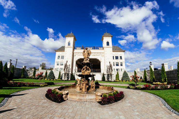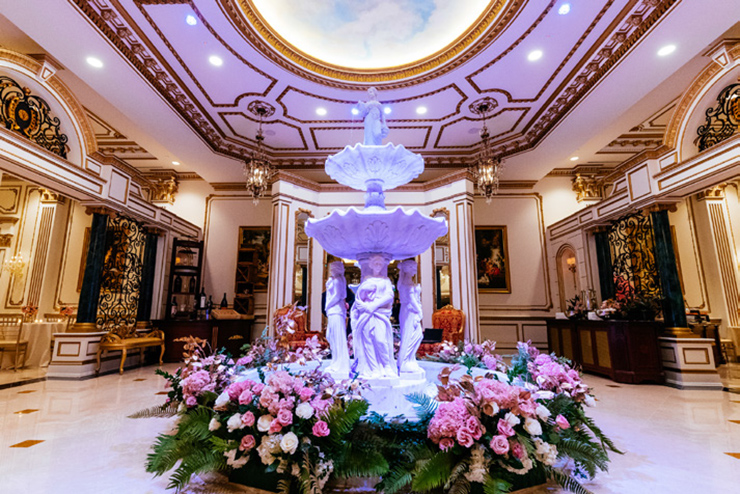 Sure. From the moment your limousine enters our gated property, you become royalty. As you drive through the exquisite French style wrought-iron gates, you will see the castle across the lake. Be sure to say Hello to the pair of resident white swans in the water. Moving along, you’ll drive under a towering arched entrance and come across a beautiful and artfully landscaped center courtyard with ramps on both sides leading to the castle. As your driver winds up the drive way to the front door, white gloved doormen open the wrought iron embellished doors to your castle. Upon arrival, you are immediately greeted by a personal attendant in the grand entrance. You are led past the classical winding stair cases, exquisite chandeliers, marble floors and lavish decorations towards the elegant ballroom and your private bridal quarters.