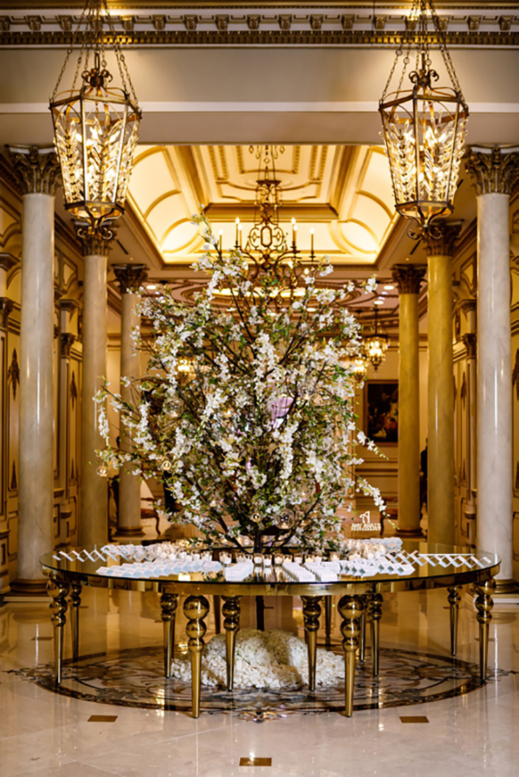 The castle doors are embellished with ornate moldings and appliques. Hand carved cartouches sit above the doorframes. Like a symphony, the architectural features and decorative elements come together to give the main lobby a sense of timeless, classic elegance.
