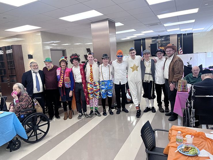 Purim day at the center included a festive fleshig seudah with the participation of young men from Lander College for Men. There were a few students who led with solo performances, and one who brought along his guitar to add to the excitement. This energized bunch brought fantastic Purim joy to every corner of the Margaret Tietz shul that held the program – from their cheerful costumes to their smiles and warm touch. Much appreciation is extended to a Sephardic child soloist who took to the mic and wowed the crowd with his rendition of "Im Eshkachech Yerushalayim," reminding all of the ongoing war against Hamas that Israel continues to fight.