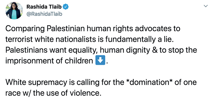 Enter Rashida Tlaib. “Comparing Palestinian human rights advocates to terrorist white nationalists is fundamentally a lie. Palestinians want equality, human dignity & to stop the imprisonment of children,” Tlaib tweeted. “White supremacy is calling for the *domination* of one race w/ the use of violence.”