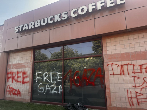 A Starbucks in Garden City, Long Island, was vandalized with pro-Palestinian graffiti, marking an escalation in tactics used by anti-Israel groups.  The graffiti, reading “Intifada is here,” “Free Gaza,” and the red triangle of Hamas, was removed by store employees.  Todd Richmond, Co-chair of Democratic Majority For Israel, shared his experience visiting the location. He engaged in a conversation with the employees and customers, educating them about the October 7 attacks by Hamas. He showed them videos and pictures from his visit to Kibbutz Kfar Aza and Kissufim, highlighting the destruction and death caused by Hamas, and explained the significance of the upside-down triangle spray-painted on walls. The employees were shocked, including the person cleaning the vandalized wall. Richmond also tipped the employees generously for their resilience.