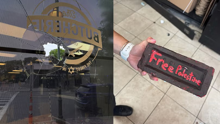 Just after midnight on Sunday, a brick inscribed with “Free Palestine” in red paint was thrown through the front window of The Butcherie, a kosher grocery store in Brookline, Massachusetts. Surveillance footage shows at least two masked individuals approaching from Coolidge Street, hurling the brick through a window displaying a map of Israeli wineries, and fleeing back down Coolidge Street. The Butcherie, a 54-year-old family-owned business in the Jewish hub of Coolidge Corner, reported no injuries. Brookline Police are investigating the incident as a hate crime, with no arrests made. Over 150 community members rallied outside the store on Sunday to show support.
